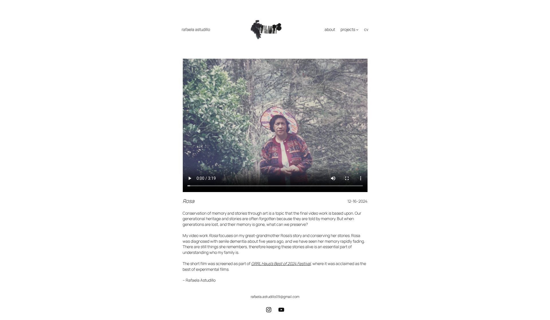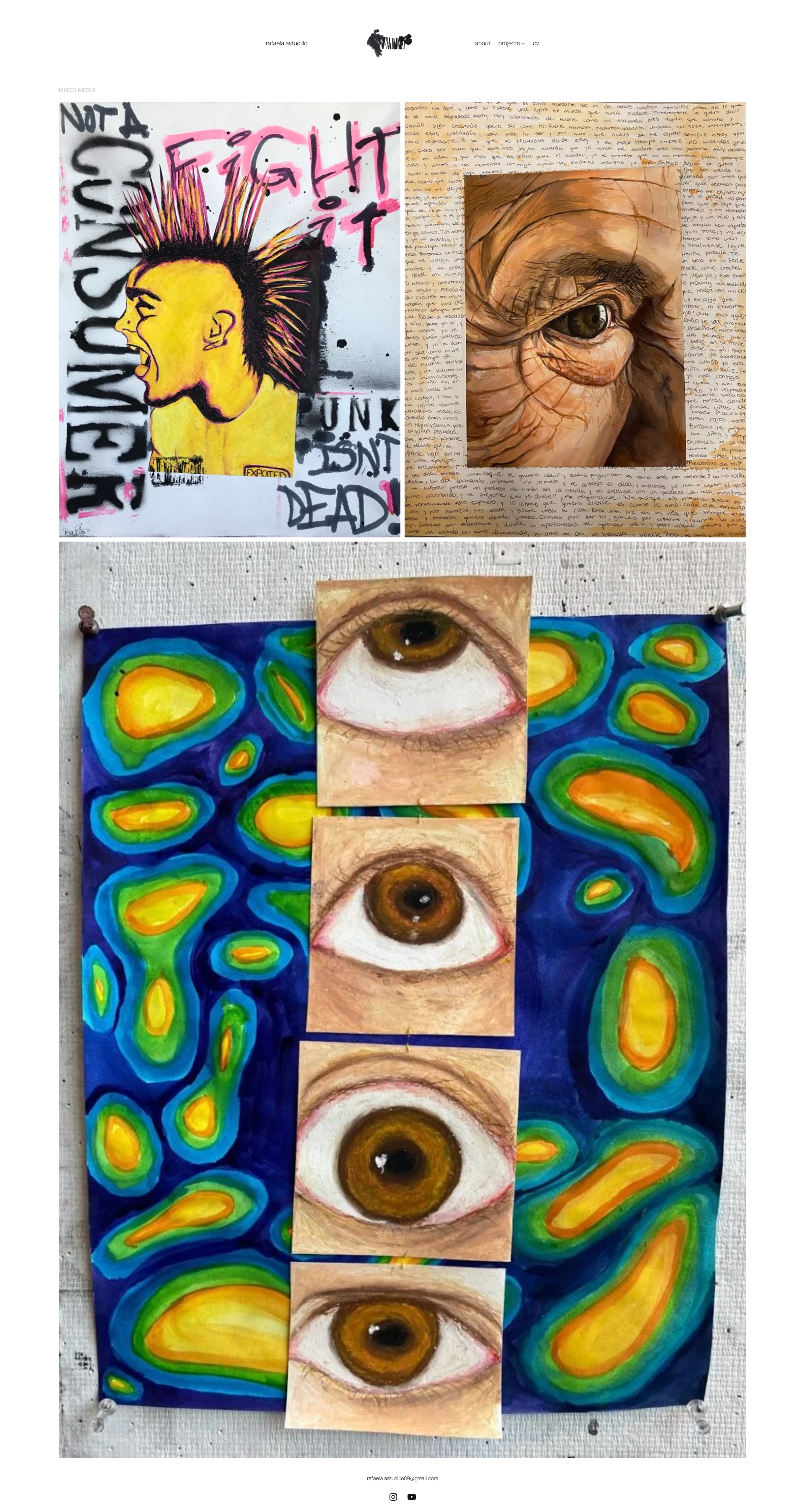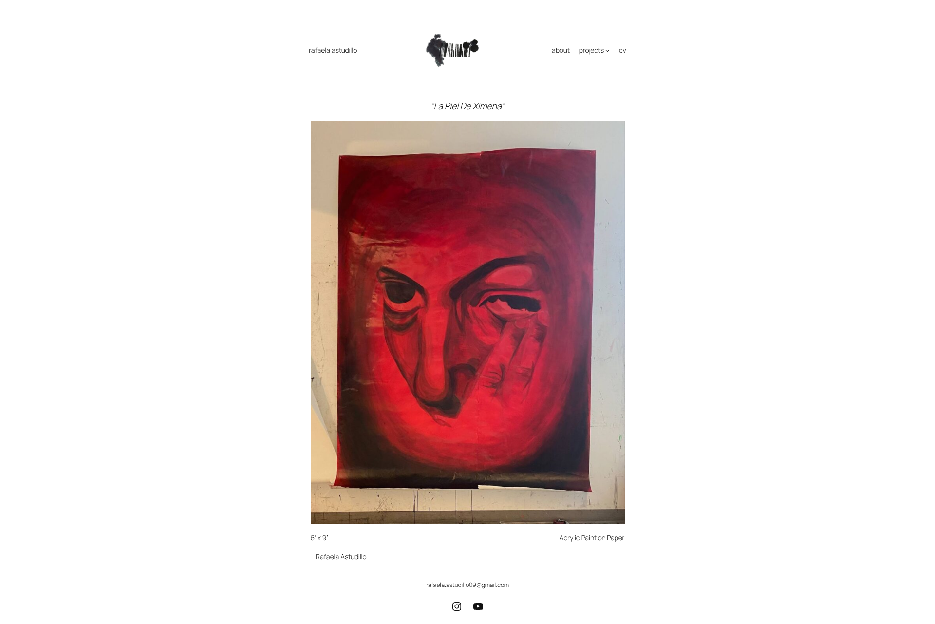 Rafaela Astudillo’s portfolio is a minimalistic, elegantly simple showcase built to keep the spotlight on her work. Her name stands boldly at the top, followed by an organized menu (with clear subcategories for different media), and a CV plus subtle links to her Instagram and YouTube. The design is ultra-clean and distraction-free, modern, making the art the main attraction.